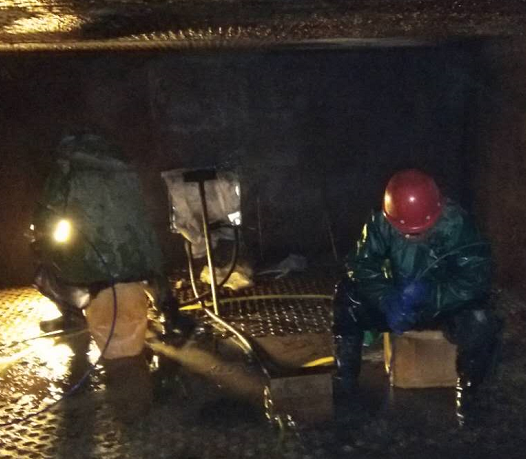 因2#鍋爐上下級空預(yù)器堵塞嚴(yán)重,無法滿足生產(chǎn)負(fù)荷要求,影響鍋爐正常運(yùn)行,2019年1月14日9點(diǎn)30分,根據(jù)公司停車檢修計(jì)劃,對2#鍋爐空預(yù)器管進(jìn)行清洗及疏通,首先在煙道底部制作排水口,引至地溝,保證現(xiàn)場路面無積水及結(jié)冰,待空預(yù)器內(nèi)溫度下降,公司領(lǐng)導(dǎo)組織崗位人員輪流進(jìn)入空預(yù)器清理積灰,為空預(yù)器管道清洗及疏通做好各項(xiàng)準(zhǔn)備工作,15日正式使用清洗機(jī)對空預(yù)器進(jìn)行帶壓清洗,所有人員不怕苦、不怕累、放棄休息時(shí)間協(xié)助外包人員及時(shí)疏通空預(yù)器堵塞管道,更換空預(yù)器套管,檢修人員雖然穿著厚厚的棉衣,但不一會(huì)也被寒冷打透。手凍僵了,他們搓了搓接著干。