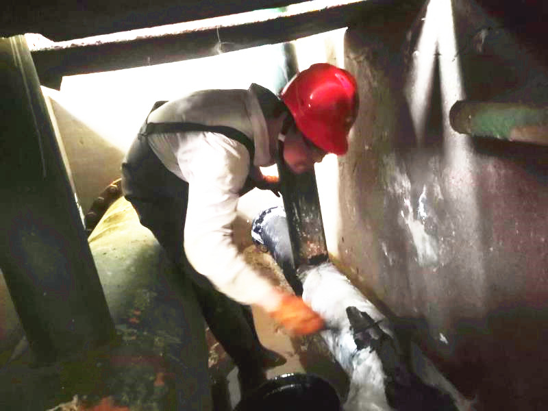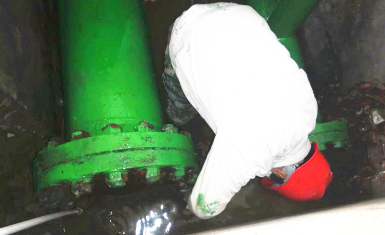 原鹵管線是采鹵崗位重要的組成部分,是停車必檢項(xiàng)之一。但是檢修難度不小,一是過(guò)道空間狹小,光線昏暗,一次僅夠兩個(gè)人同時(shí)作業(yè);二是檢修原鹵管線時(shí),必須“涉水”作業(yè)。檢修期間原鹵管線一閃一閃的焊光將周圍照亮,順著火花向里看去,只見(jiàn)有兩個(gè)人在狹小的空間綣著身子低頭忙活著,感覺(jué)身子都轉(zhuǎn)不開(kāi)的樣子。他們像小貓似的蜷縮在兩邊,全身濕透,白色的工服也被銹漬染的亂起八糟,被油漬沁透成一坨一坨的,但他們堅(jiān)定的眼神、專注的神情卻叫人佩服。我不禁問(wèn)道:“這么窄的空間人咋進(jìn)去啊?”他們開(kāi)玩笑的說(shuō):“用縮骨功!”