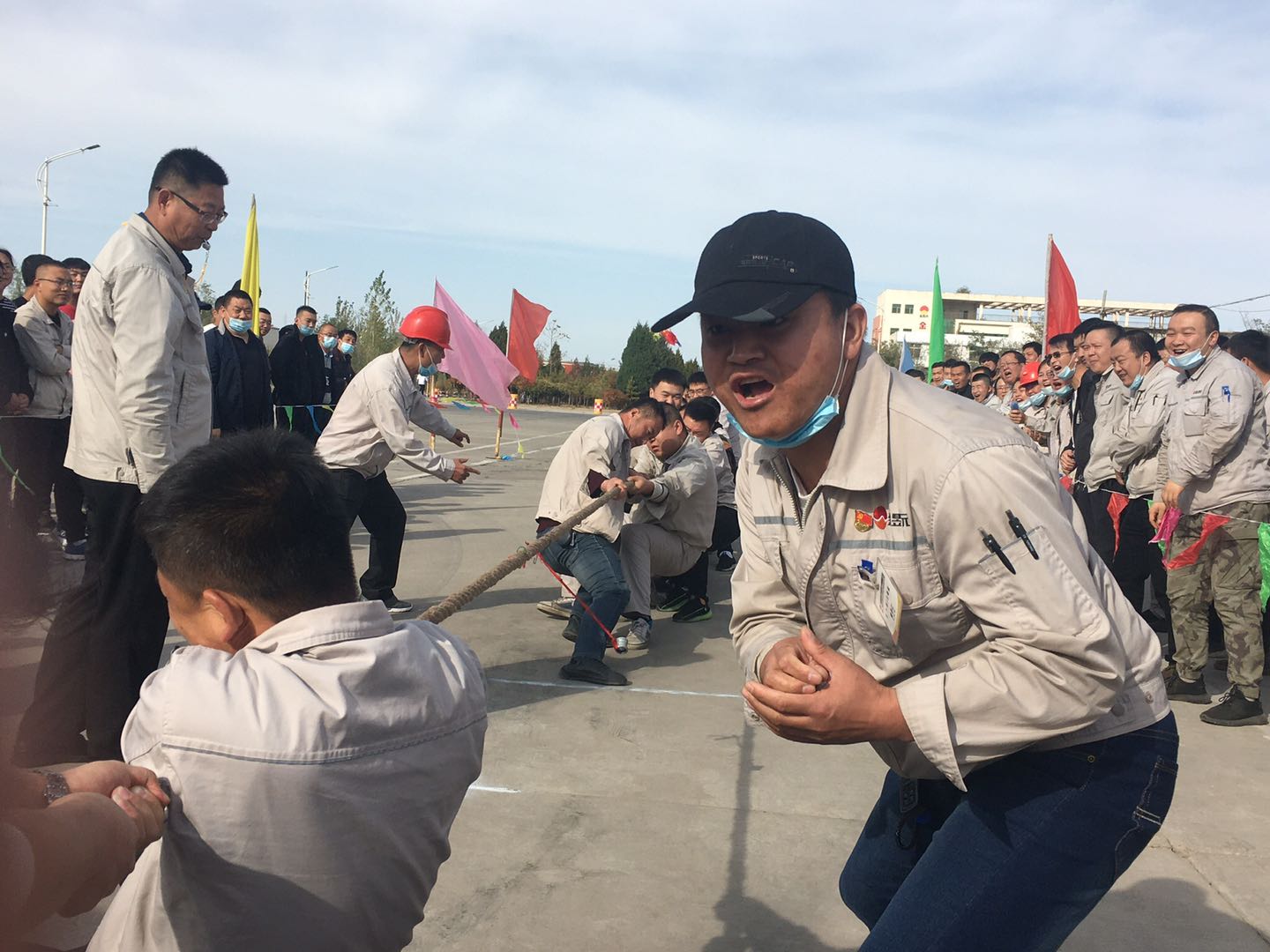 當比賽的哨聲響起,只見參賽的隊員們緊握長繩卯足勁拼命往后拉,有的同志臉憋得通紅卻絲毫不放松,有的“面部猙獰”使盡渾身解數(shù),還有的干脆閉上眼睛卯足了勁兒往后拉。女同志們更是不甘示弱,一個個咬緊牙關,將巾幗不讓須眉的精神風貌發(fā)揚得淋漓盡致。未參賽的員工自發(fā)組成啦啦隊為比賽隊員吶喊加油。哨子聲、吶喊聲此起彼伏,給比賽增添了一抹亮色,每一聲吶喊都帶來一股力量,現(xiàn)場激烈的比賽將整個活動推到了高潮。