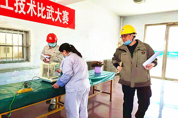 比賽現(xiàn)場(chǎng)女職工熟練的操作技能,沉著冷靜,對(duì)電石破碎樣品進(jìn)行計(jì)量稱重;對(duì)工作一絲不茍,嚴(yán)格把控電石發(fā)氣量。