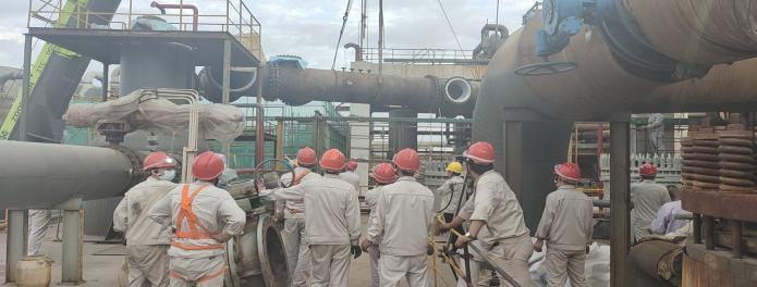 第一天氯乙烯裝置迅速拉開檢修戰(zhàn),先是對(duì)水堿洗組合塔進(jìn)、出管口線漏點(diǎn)進(jìn)行消除,安排吊車及相關(guān)人員在場(chǎng),辦證,拆除管節(jié)前的準(zhǔn)備工作做好后立即組織人員開始卸閥門,在檢修工和吊車的完美配合下,漏點(diǎn)的管節(jié)拆除完成,后安排生產(chǎn)科主管去平羅襯塑。另外一邊精餾場(chǎng)地也是熱鬧非凡,檢修工作雖然忙碌但不盲目,人員拆除,你卸閥門,他焊缺口,我高空作業(yè),吊車協(xié)助拆卸高低塔塔盤篩網(wǎng),安全著陸后立即組織人員進(jìn)行清洗,清洗完成后又組織安裝,一切如行云流水,維修工熟悉的手法給安全檢修及順利開車又加了一道保險(xiǎn);旌厦撍芫技改是片區(qū)及集團(tuán)公司領(lǐng)導(dǎo)關(guān)注的重點(diǎn),此次檢修,管線碰口,也是尤為重要,在相關(guān)技術(shù)人員及維修工的協(xié)作下,做了氣相預(yù)留口,為后期混合脫水項(xiàng)目開車平穩(wěn)運(yùn)行埋下了伏筆。