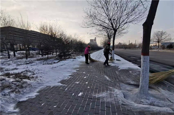 裝置門前的松樹上掛滿雪球看著調(diào)皮且可愛,九點過后太陽開始照射,遠遠望去整個廠區(qū)銀光閃閃,讓人移不開眼。雖然雪景美麗但因為路面積雪會導致員工滑倒等危險,且廠區(qū)其他生產(chǎn)場地都需繼續(xù)生產(chǎn),不能因下雪而影響,所以在欣賞完雪景后的我們也開始了積雪大清掃活動。