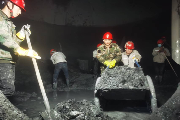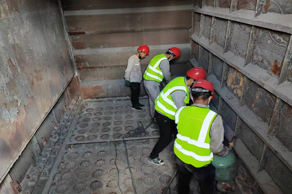 脫硫塔檢修現場,塔內料液堆積多,空間小,清理難度大,只能用小推車一車一車的拉運到人孔門,再一鍬一鍬的鏟上鏟車,工作量非常大,只有熱力裝置的人很難在檢修時間內完成料液清理工作。公司總經理、副經理守在現場,協(xié)調各科室、裝置人員協(xié)助清理,兩天兩夜沒有間斷,在滿是泥水的脫硫塔內來來回,奔跑了無數次,污泥沾滿了全身每一個地方,不知是汗水還是泥水浸濕了衣服,他們干活不分你我,不惜力氣,相互配合,安全高效的完成了料液清理工作,為下一步脫硫塔消漏、防腐做好鋪墊。