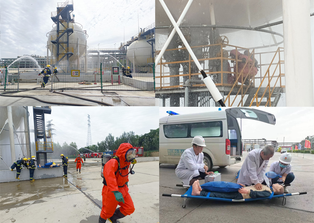 本次演練主要內(nèi)容是:2023年6月28日,金昱元廣拓能源有限公司2#罐區(qū)氯乙烯單體球罐發(fā)生泄露,在裝置處置過(guò)程中,搶修人員出現(xiàn)中毒癥狀,隨著泄露量的不斷增大,泄漏點(diǎn)突然起火,造成人員傷亡。在應(yīng)急指揮部的科學(xué)決策、正確指揮下,經(jīng)過(guò)廣拓能源公司及多方應(yīng)急救援力量的協(xié)同配合下,這一起危險(xiǎn)化學(xué)品泄露燃爆事故最終得到了成功處置。