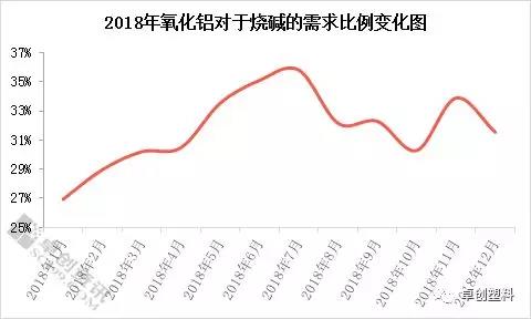 根據(jù)卓創(chuàng)監(jiān)測,2018年氧化鋁對于燒堿的需求占比達(dá)到33%-34%,如上圖所示,2018年大多數(shù)月份氧化鋁行業(yè)對燒堿需求比例均超過30%,其中個別月份最高需求占比達(dá)到35.81%左右,最少的月份需求占比也在27%左右。毫無疑問,氧化鋁是目前燒堿下游需求行業(yè)中的“頂梁柱”般的存在,對燒堿市場起到明顯剛性需求支撐,是燒堿行業(yè)最值得信賴的需求點。
