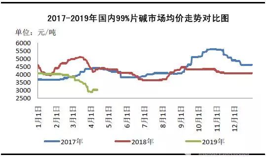 圖1 2017-2019年國(guó)內(nèi)99%片堿市場(chǎng)均價(jià)走勢(shì)對(duì)比