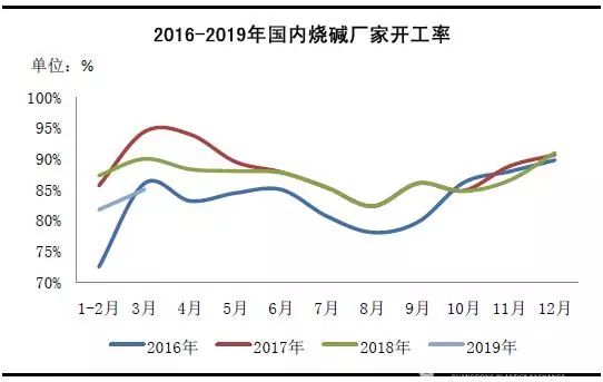 圖2 2016-2019年國(guó)內(nèi)燒堿廠家開(kāi)工率
