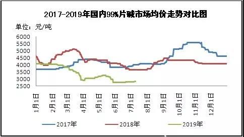圖1 2017-2019年國內(nèi)99%片堿市場(chǎng)均價(jià)走勢(shì)對(duì)比圖