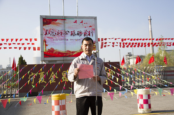 升旗儀式伊始,集團(tuán)公司黨委副書記王立軍,集團(tuán)公司副總裁、青銅峽片區(qū)總經(jīng)理尚興向升旗儀式致辭。