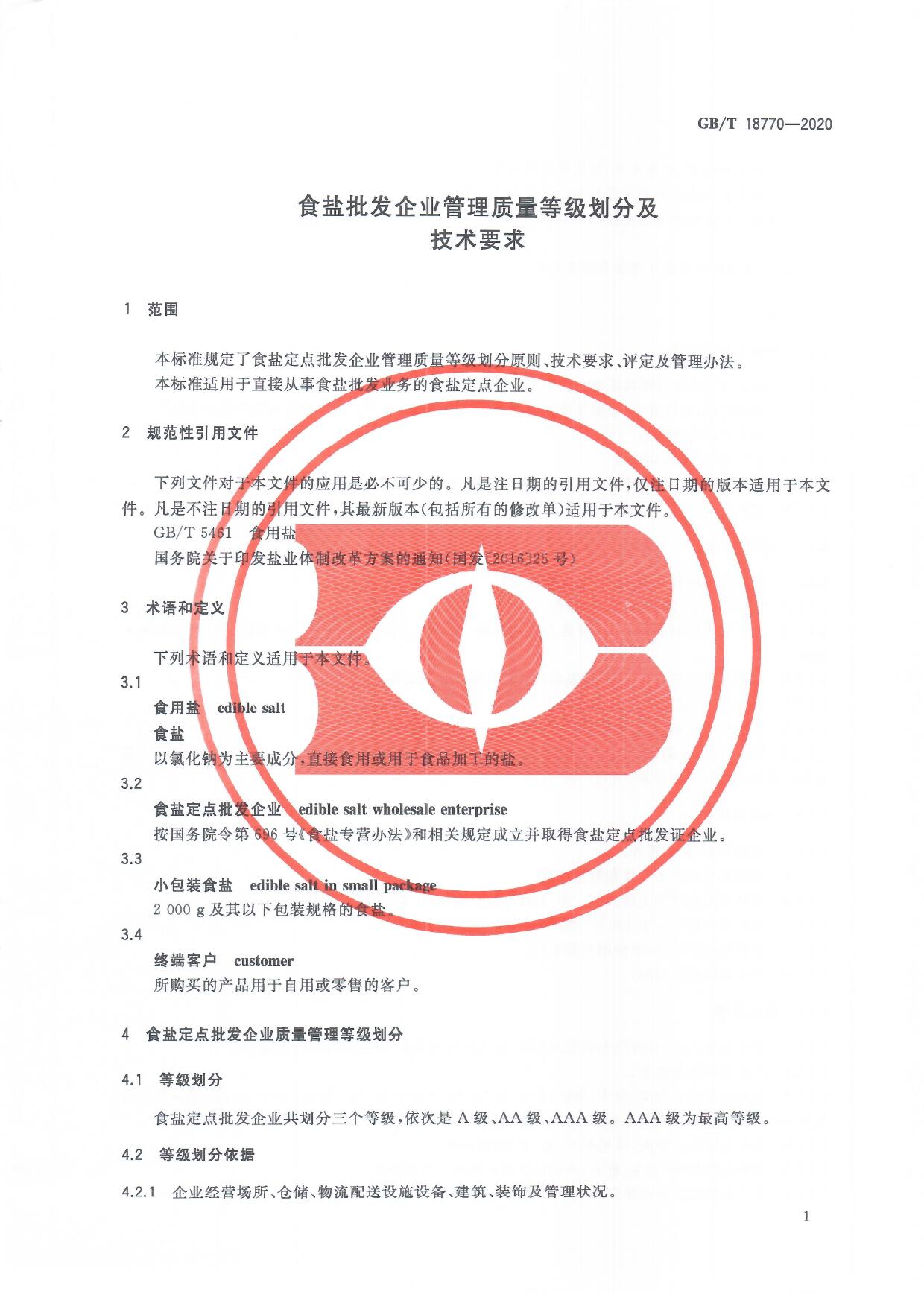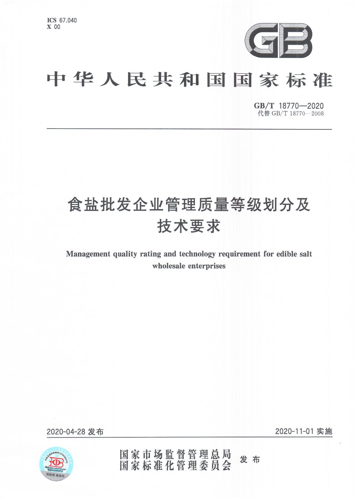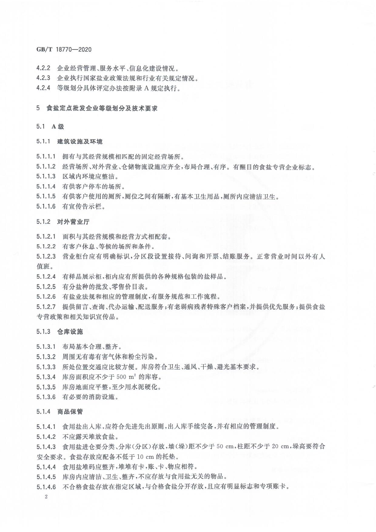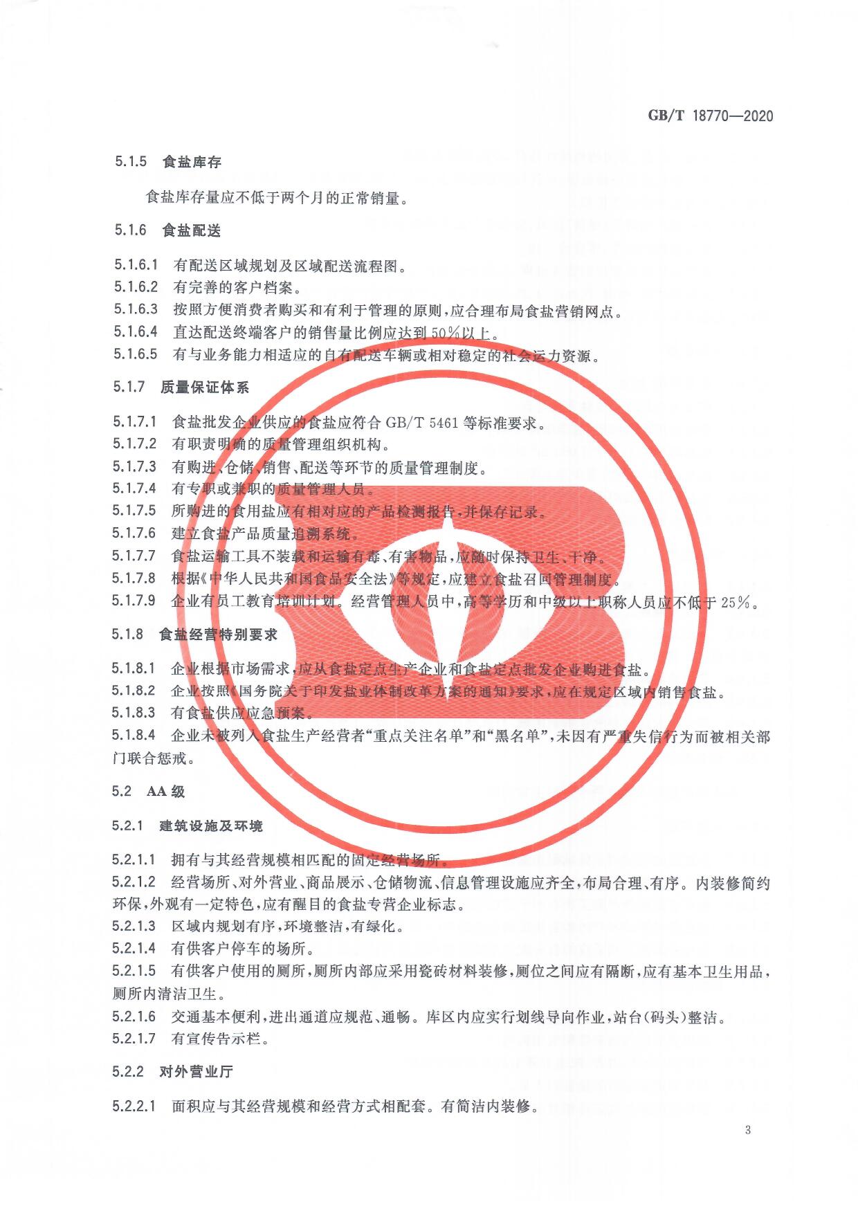 食鹽批發(fā)企業(yè)管理質量等級劃分及技術要求(GB/T 18770-2020)