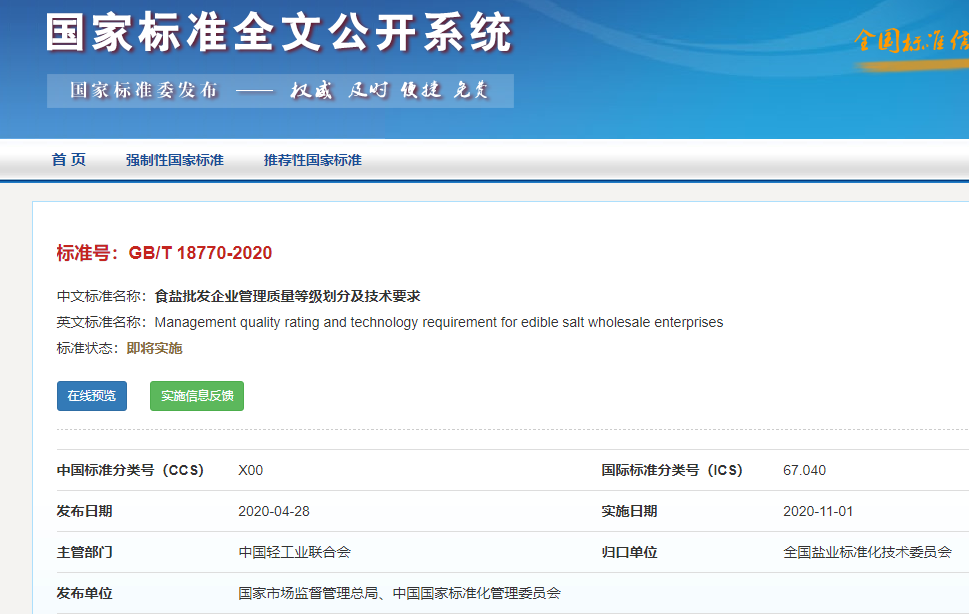 GB/T18770-2020標準今年11月1日實施在即,需要明白的是當由食鹽定點批發(fā)點企業(yè)自律實施,涉及標準與鹽改方案、部委《通知》及省鹽業(yè)主管部門實施文件抵觸的疑慮或問題,可以根據規(guī)范效力原則適用并按規(guī)定渠道反映。