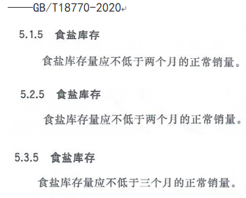 GB/T18770-2020標準提出A、AA級企業(yè)“應不低于”二個月正常銷量儲備,AAA級企業(yè)“應不低于”三個月正常銷量儲備,井礦鹽區(qū)生產精制鹽按市場需要產出,不象海湖鹽區(qū)產場集中生產堆垛,在目前市場競爭條件下難以實現(xiàn),能夠達到一個月正常銷量食鹽儲備都很不錯了。