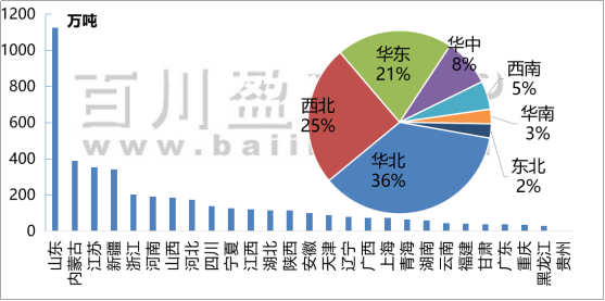產(chǎn)能:增產(chǎn)集中地為江蘇、內(nèi)蒙古、山東、河北、新疆地區(qū),預(yù)計到2023年,中國燒堿產(chǎn)能約4600-4700萬噸,山東省燒堿產(chǎn)能將逼近1300萬噸,新疆維吾爾自治區(qū)燒堿產(chǎn)能有望突破400萬噸,江蘇、內(nèi)蒙古及新疆三地?zé)龎A生產(chǎn)能力旗鼓相當(dāng)。