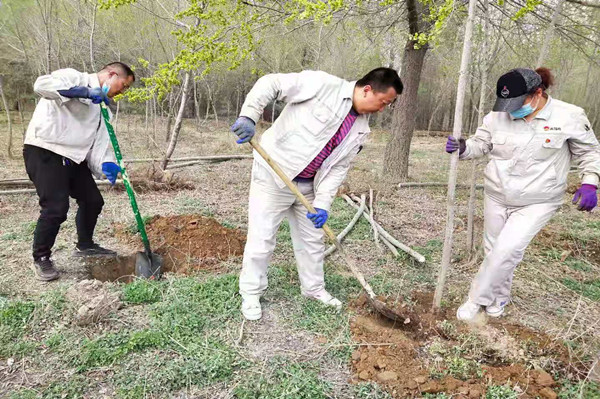 參加植樹的職工一到現(xiàn)場,便投入到火熱的工作中。大家或揮鍬挖坑,或扶苗培土,或提桶澆水,所有人齊心協(xié)力、相互配合,現(xiàn)場一片繁忙景象。
