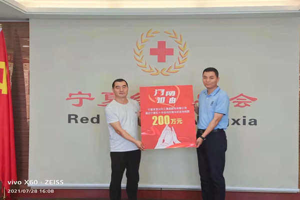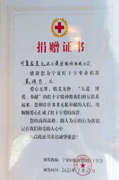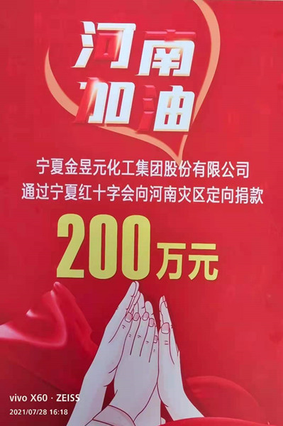 洪災(zāi)無(wú)情,人間有愛。7月28日,寧夏金昱元化工集團(tuán)股份有限公司委托寧夏紅十字會(huì)向河南災(zāi)區(qū)捐助二百萬(wàn)元,馳援河南受災(zāi)地區(qū),表達(dá)對(duì)災(zāi)區(qū)人民的深切問候。