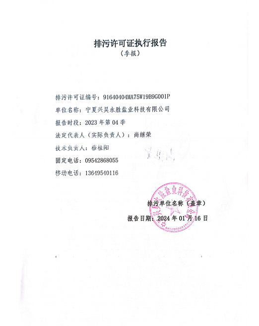 寧夏興昊永勝鹽業(yè)科技有限公司2023年第4季度排污許可執(zhí)行報(bào)告